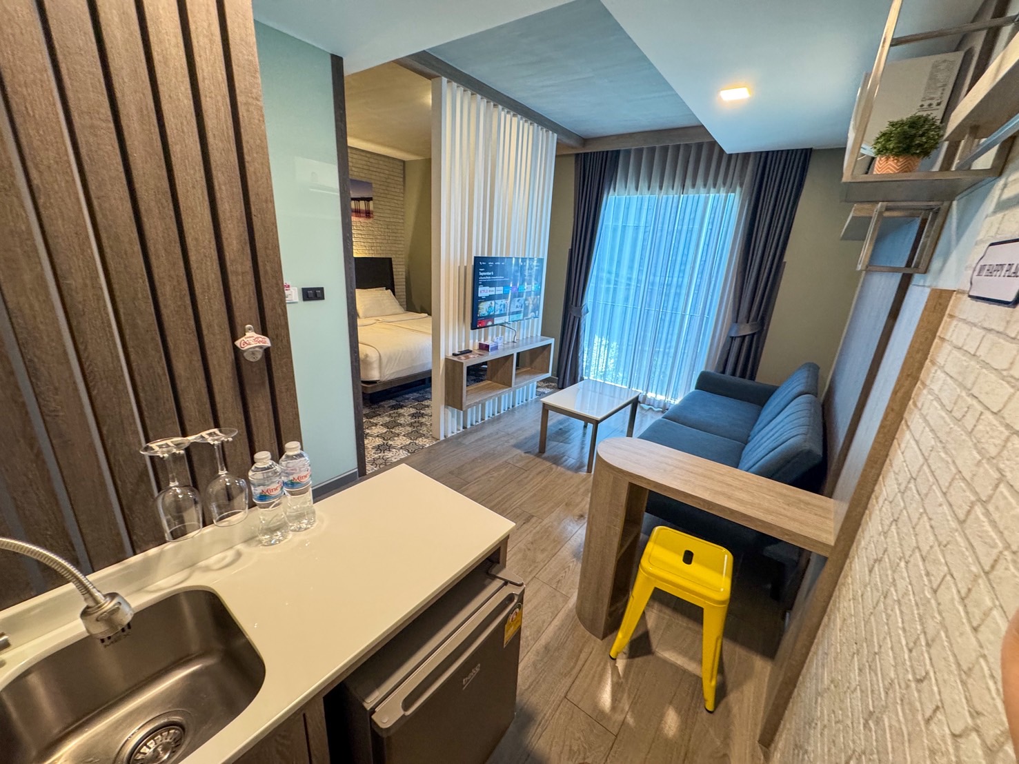 Double Room ราคา 980/คืน ขนาดห้อง 30 ตารางเมตรแยกโซนห้องนอนห้องนั่งเล่น มีโซฟาแบบใหญ่ (โซฟาสามารถปรับเป็นเตียงได้) มีซิงค์ล้างจานและมีตู้เย็นและมินิบาร์ พร้อมกับ smart TV รุ่นใหม่มีหลายแอปและหลายฟังชั่นให้เลือกดูเลือกชม บริการเช็คอิน 24 ชั่วโมง