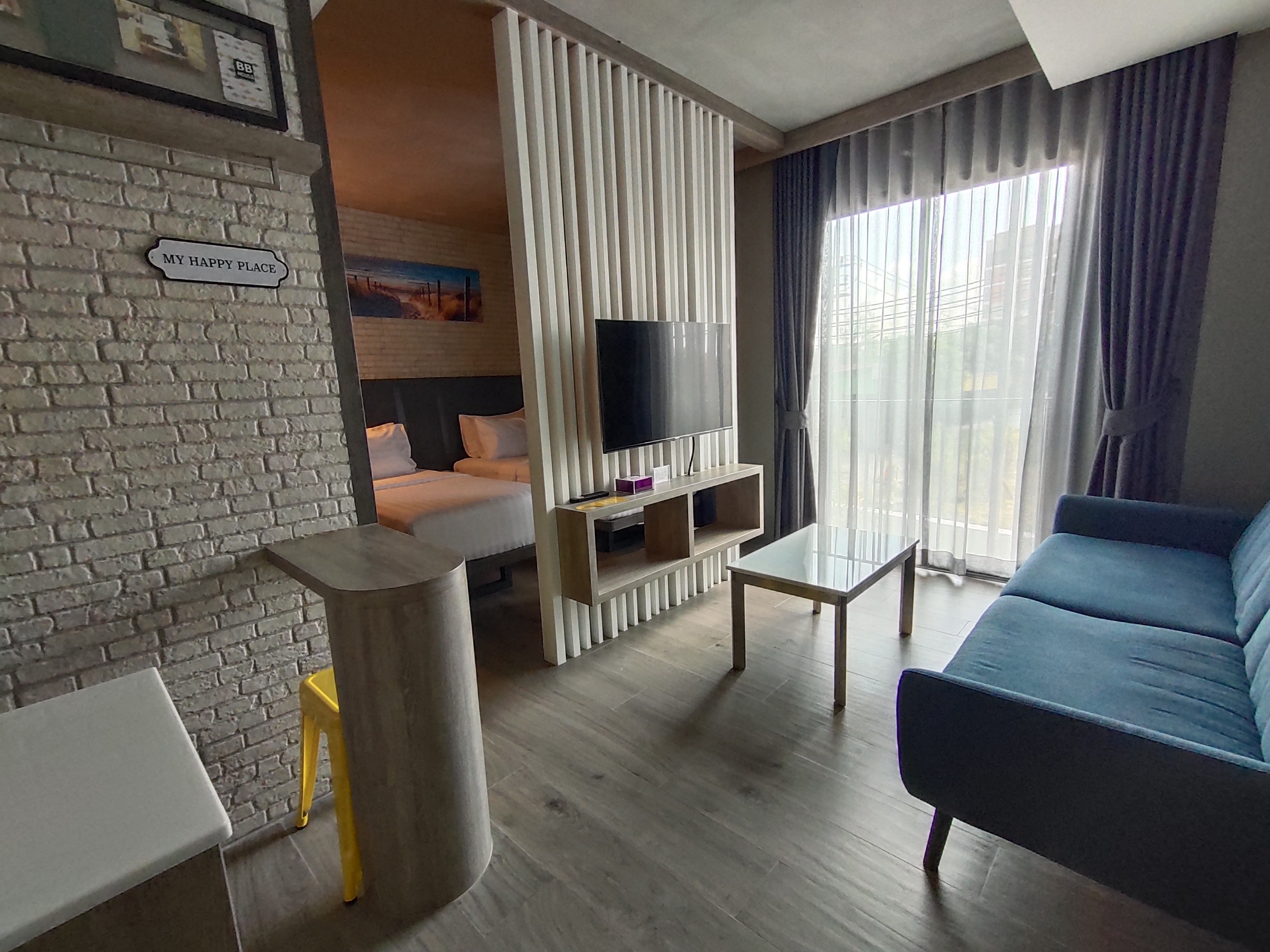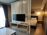 บริการห้องพักปรับอากาศ มีตู้เย็น มินิบาร์นั่งดื่ม โซฟานั่งเล่นโต๊ะวางของ ตู้เสื้อผ้า สมาร์ททีวีจอแบน